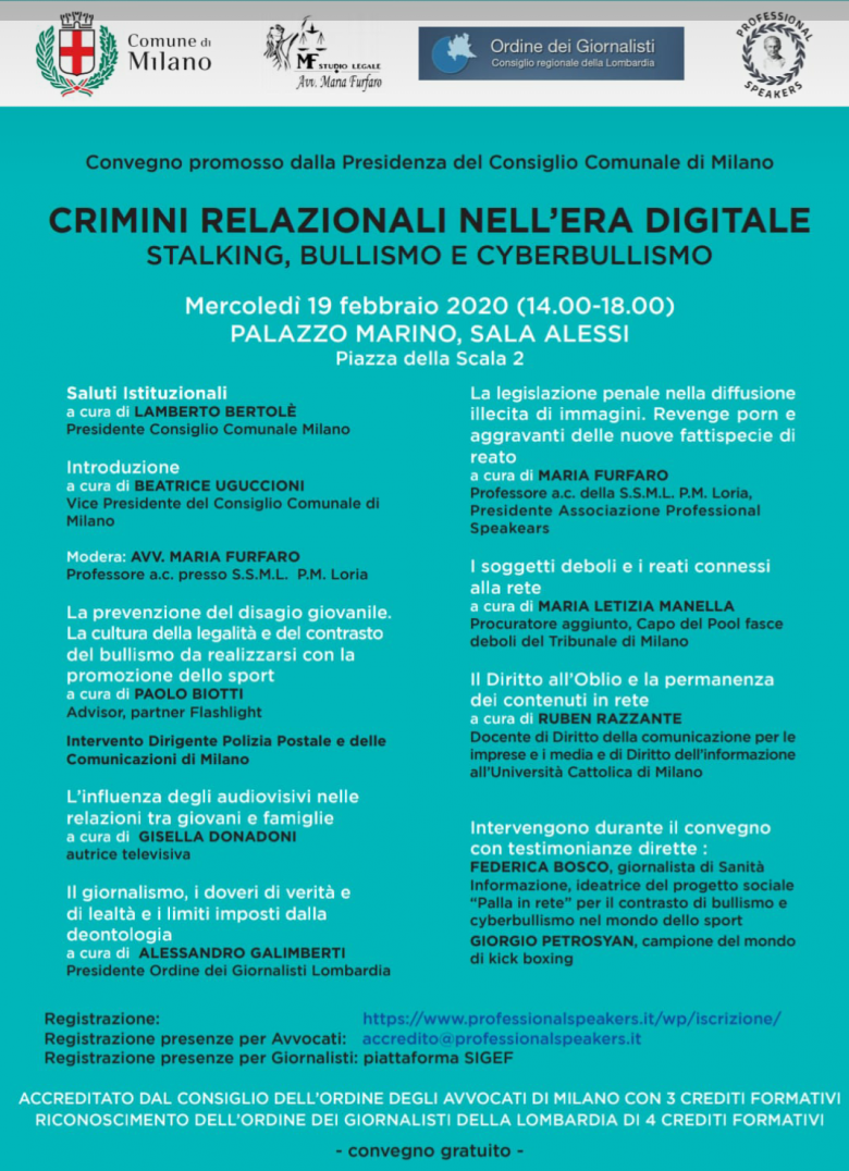 Il Convegno dal titolo “I Crimini relazionali nell’era digitale, stalking, bullismo e cyberbullismo”, promosso dal Consiglio Comunale di Milano per la formazione di Avvocati e giornalisti dei rispettivi Ordini professionali, …