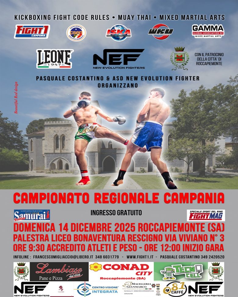 ECCO ONLINE LA MODULISTICA DEL CAMPIONATO REGIONALE FIGHT1 CAMPANIA DOMENICA 14 DICEMBRE 2025 A ROCCAPIEMONTE (SA)