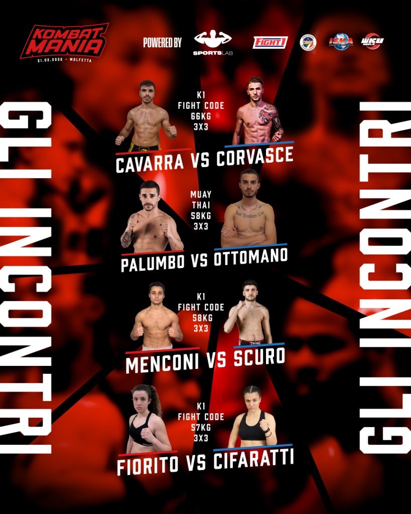 Fari puntati sui quattro match PRO in programma: in copertina il barlettano Daniele Scuro sfiderà Matteo Menconi nella categoria K-1 Fight Code 3×3 -58kg. Nel K-1 Fight Code 3×3 -66kg si affronteranno Davide Cavarra e Corrado Corvasce, anche lui eccellenza di casa. Nel Muay Thai 3×3 -58kg incrocio tra Giuseppe Palumbo e Natalino Ottomano. Sfida al femminile tra Valeria Fiorito e Aurora Cifaratti nella categoria K-1 Fight Code 3×3 -57kg. «Una serata che promette spettacolo vero, ritmo alto e adrenalina dal primo all’ultimo match – assicura Antonio Lisi – il conto alla rovescia è iniziato. Ora non resta che attendere Kombat Mania XIV».